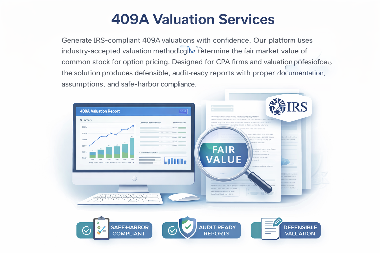 Generate IRS-compliant 409A valuations with confidence. Our platform supports industry-accepted valuation methodologies to determine the fair market value of common stock for option pricing. Designed for CPA firms and valuation professionals, the solution produces defensible, audit-ready reports with proper documentation, assumptions, and safe-harbor compliance.