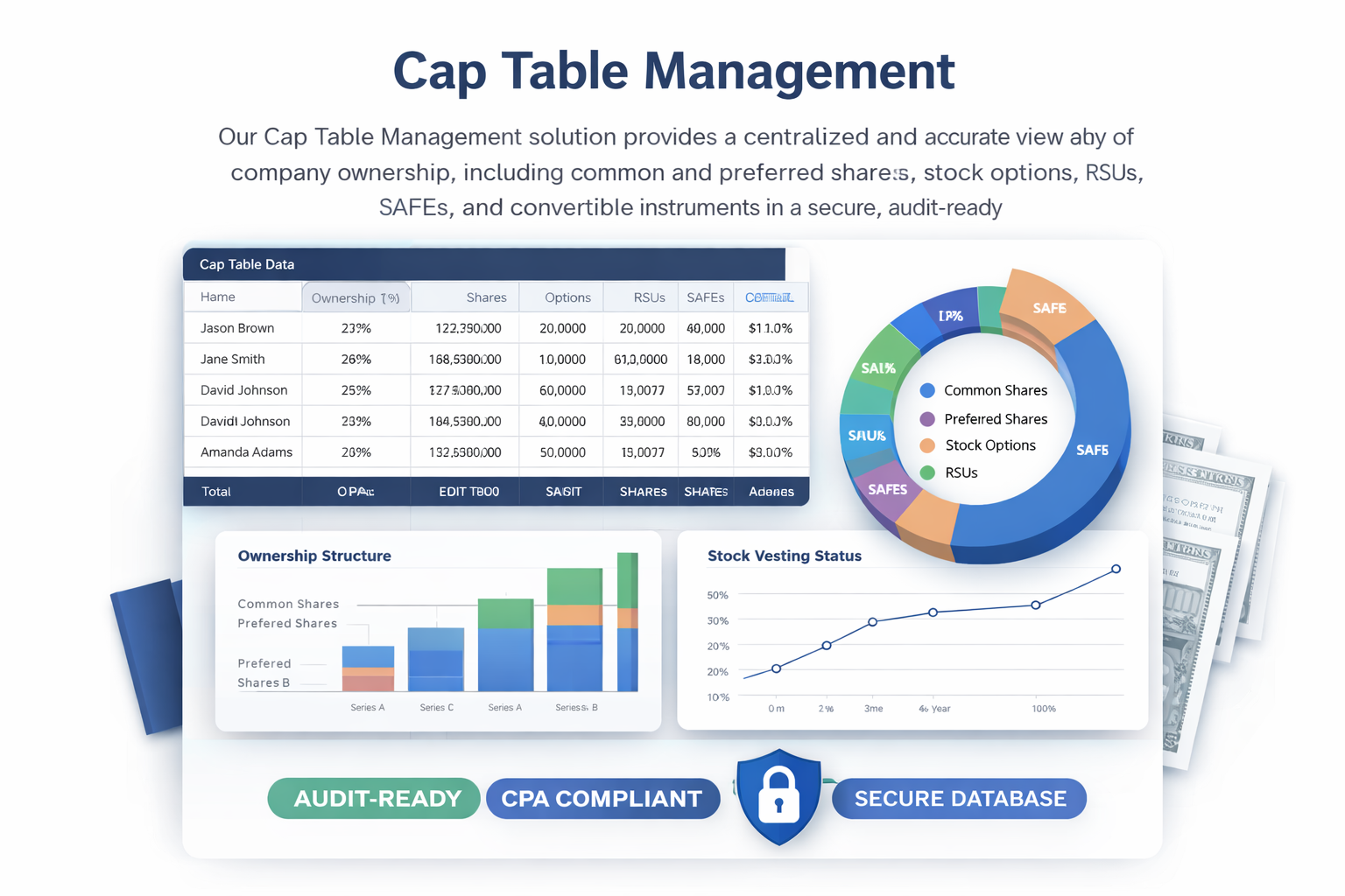 Our Cap Table Management solution provides a centralized and accurate view of company ownership. Easily manage common and preferred shares, stock options, RSUs, SAFEs, and convertible instruments in a secure, audit-ready environment. The platform tracks historical changes, vesting schedules, and fully diluted ownership, helping CPA firms and valuation professionals maintain clean, reliable equity data for reporting, valuations, and audits.