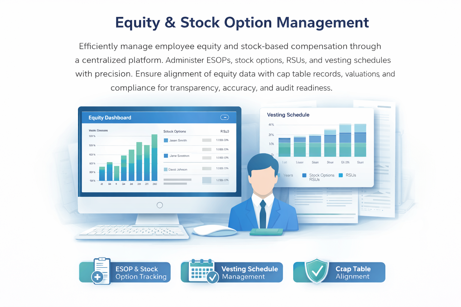 Manage employee equity, stock options, RSUs, and ESOPs with accurate vesting schedules while maintaining fully diluted ownership and valuation‑ready records.